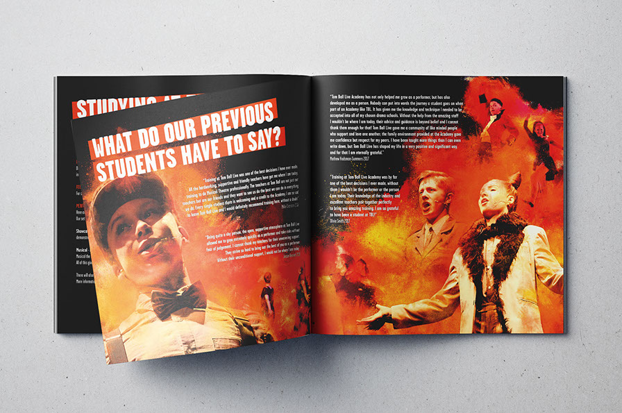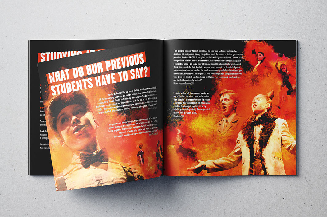 Taking the established TBL group colours of orange & black, we added explosive powder blasts to the performance and class photography of the students, giving energy to the text heavy booklet and channelling the expressive nature of the college.