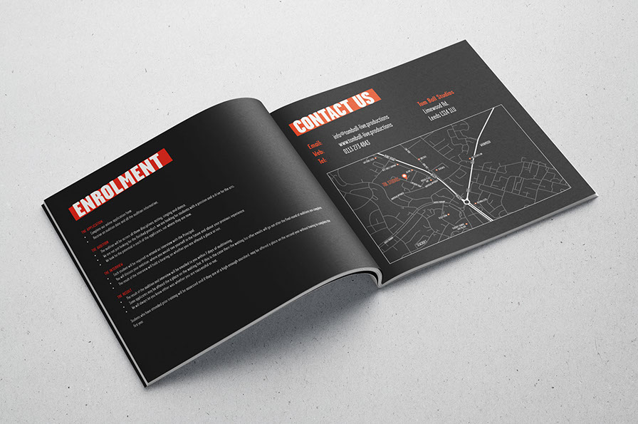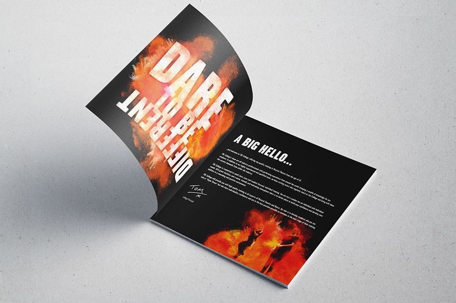 Taking the established TBL group colours of orange & black, we added explosive powder blasts to the performance and class photography of the students, giving energy to the text heavy booklet and channelling the expressive nature of the college.